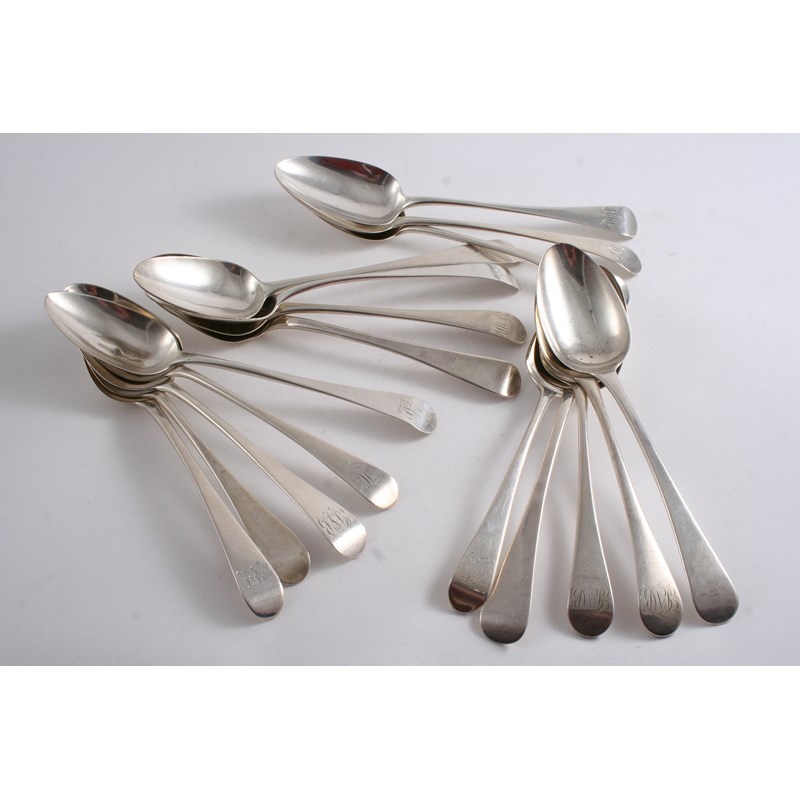 SEVENTEEN VARIOUS GEORGE III/IV OLD ENGLISH PATTERN TABLE SPOONS most with initials, mixed makers & dates; 31.3 oz (17)