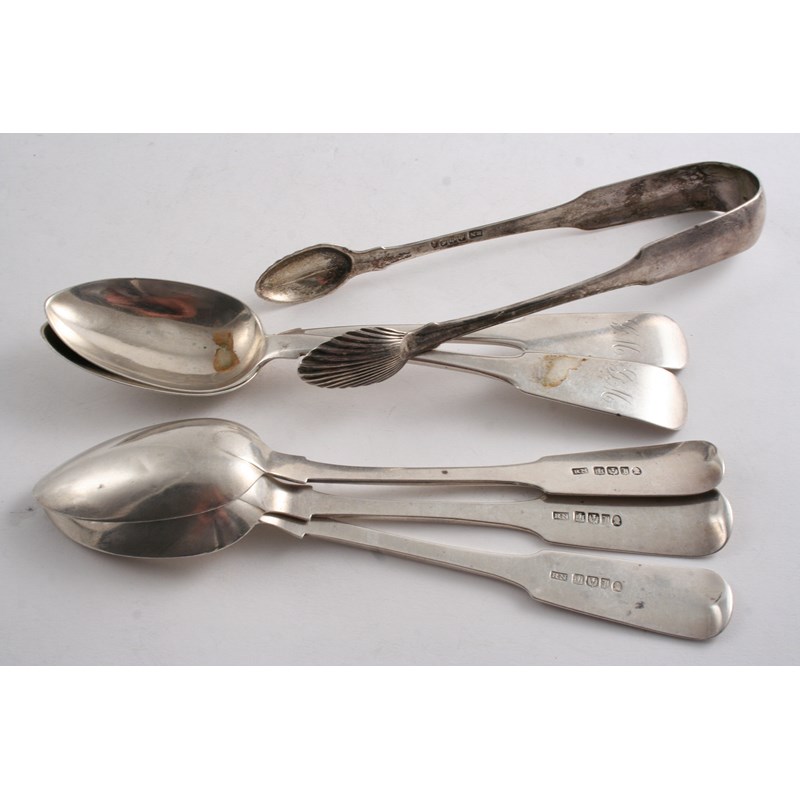 initialled and a pair of sugar tongs with fluted bowls, all by Robert Naughton, Inverness (with hallmarks for Edinburgh 1837 & 1840); 7.25 oz (6)