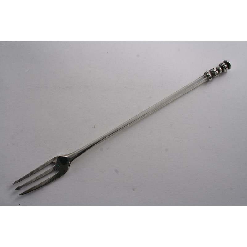 A VICTORIAN SEAL TOP PICKLE FORK with a long, tapering, hexagonal stem, crested, by George Adams, London 1867; 9" (23 cms) long; 1.8 oz