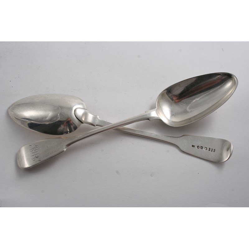 A PAIR OF SCOTTISH PROVINCIAL FIDDLE PATTERN TABLE SPOONS initialled "JMW", by William Jamieson, Aberdeen (WJ, A, B, D, WJ, WJ, WJ) c.1830; 3.8 oz (2)