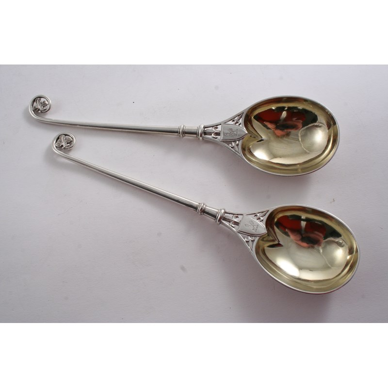 with stems resembling a Bishop's crozier & gilt bowls with pierced junctions, crested, by Francis Higgins, London 1879; 8.2" (20.8 cms) long; 4.2 oz (2)