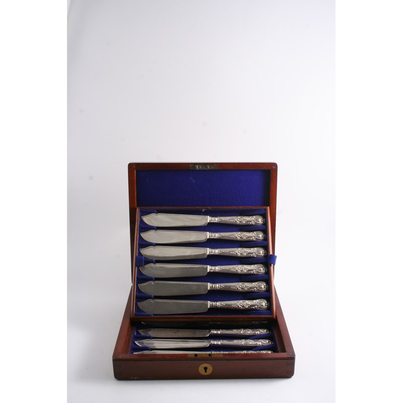 A VICTORIAN CASED SET OF TWELVE FISH KNIVES with Queen's pattern handles, by Francis Higgins, London 1876/77 (loaded); the case 10.3" (26 cms) long