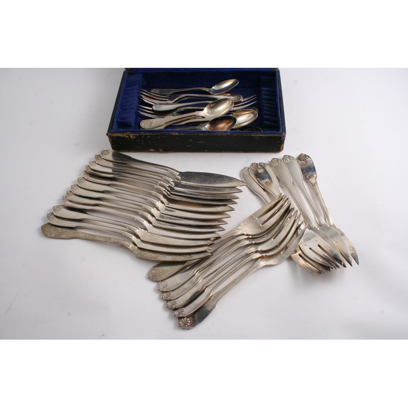 A set of twelve 20th century French fish knives and forks in a version of Fiddle, Thread & Shell pattern, each engraved with a cypher, maker's mark of Emile Puiforcat, Paris 1900-1930 together with twelve pieces of plated flatware; 53.4 oz weighable silver (36)