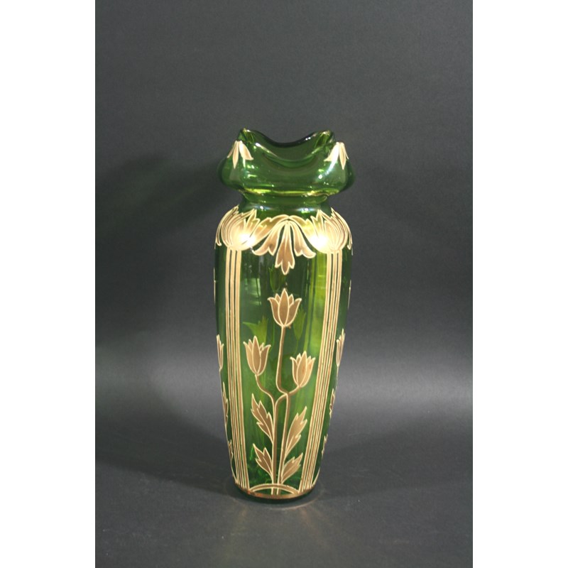 ART NOUVEAU GLASS VASE a tall slender green glass vase, with an Art Nouveau floral design in gold. Unsigned, 12 1/4ins (31cms) high