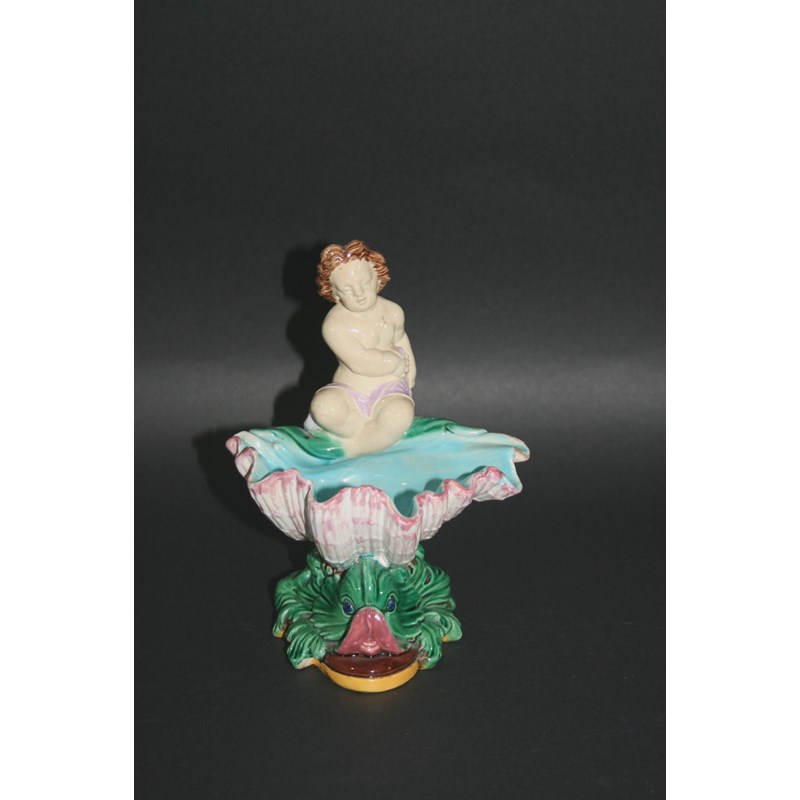 possibly by Minton, with a a cherub figure seated on a shell and mounted on a sea creature. Impressed mark (very difficult to read), 6 3/4ins (17cms) high