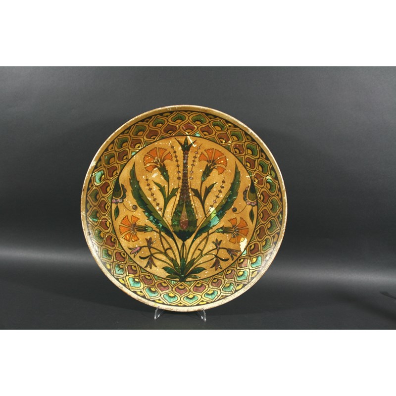 MINTON CHARGER of Islamic influence, the central panel painted with flowers and foliage and with floral motifs in borders around the rim. Impressed mark, Minton and monogram mark. 17ins (43cms) diameter