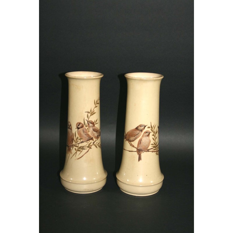two slender vases, each painted with Birds on branches and on a buff ground. Various impressed marks, Royal Doulton, FEB (Florence Barlow), 700, 854DW. 10 1/4ins (26cms) high. (2)
