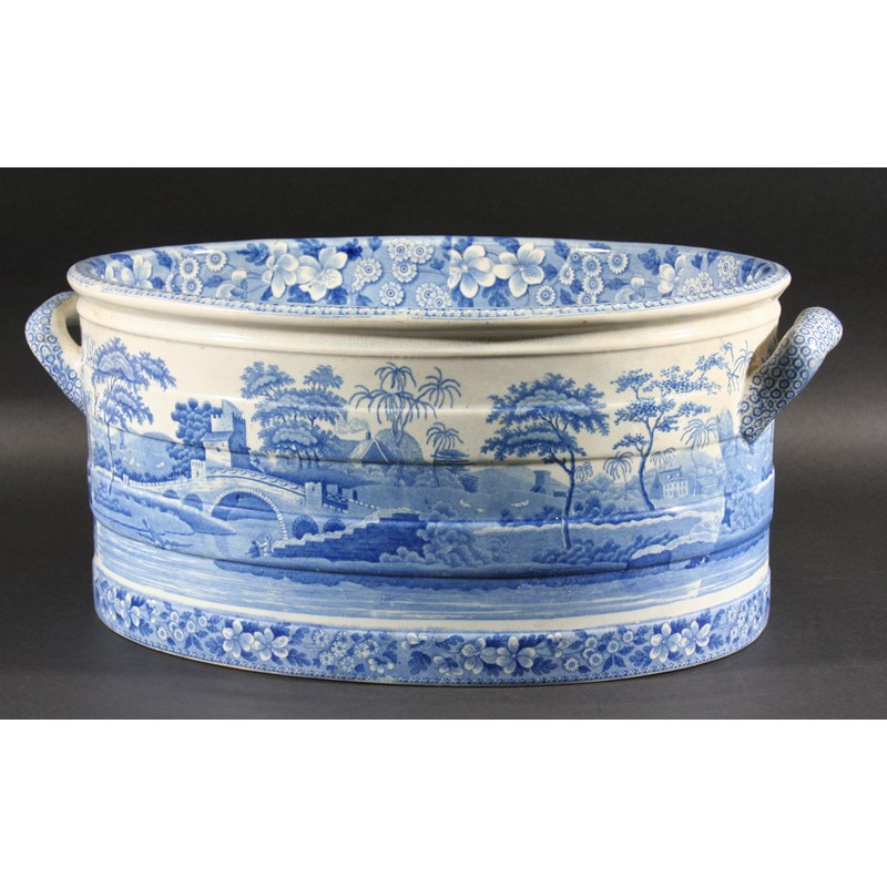 SPODE PEARLWARE FOOTBATH, 19th century, oval, blue transfer printed in the Tower pattern, impressed marks, length including handles 47.5cm