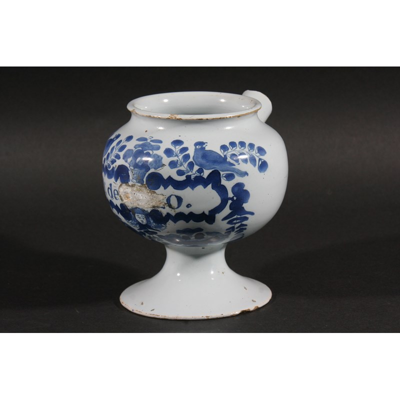18th century, the ovoid body with short spout on a spreading foot, a blue cartouche surrounded by birds in branches, height 13cm