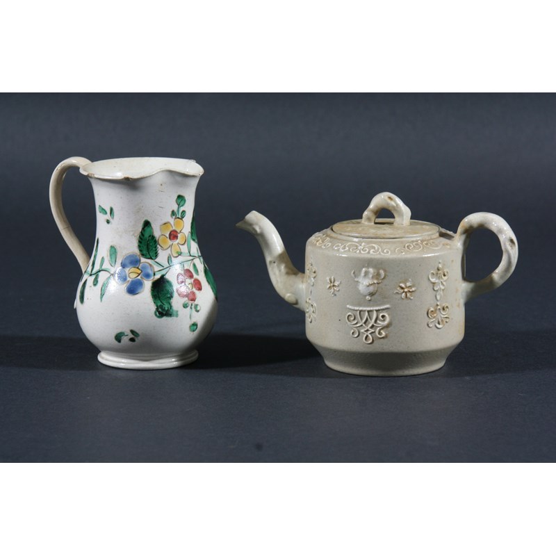 mid 18th century, with applied foliate cameos and crabstock handles, height 7cm; together with a salt glazed stoneware cream jug, of baluster form with painted floral decoration, height 8.5cm (2)