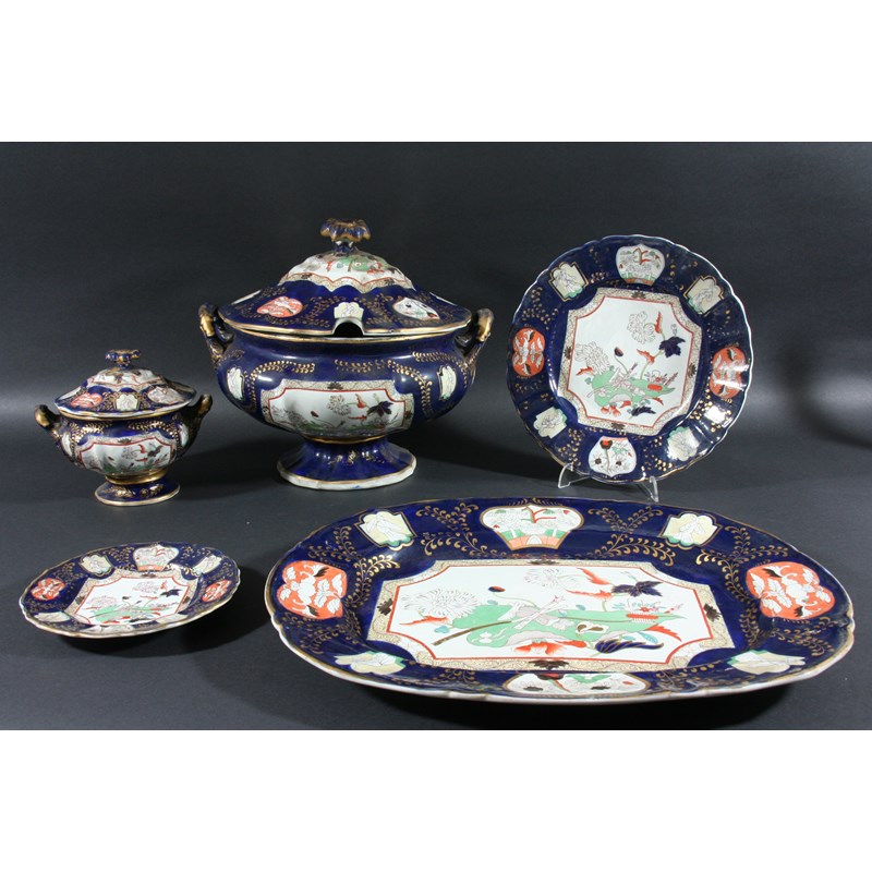 circa 1830-40, decorated with musical instruments inside a deep blue border with figural and floral panels and gilt sprigs, comprising plates in various sizes, platters in various sizes, vegetable, soup and sauce tureens, covers and stands, printed marks (parcel)