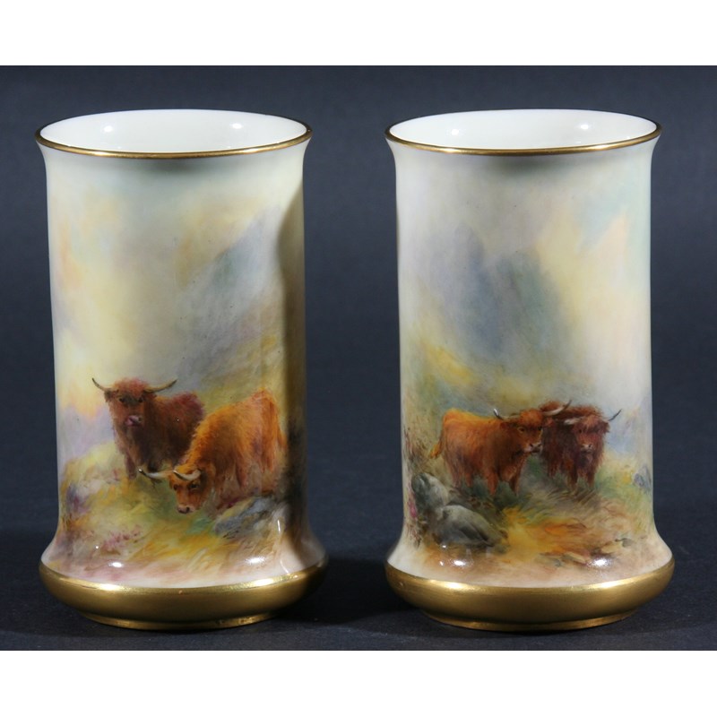 PAIR OF ROYAL WORCESTER CYLINDER VASES, by Harry Stinton, date code for 1926, model 2510, painted with highland cattle, signed, puce printed marks, height 10.5cm (2)