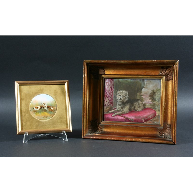signed, date code for 1932, painted with a pair of hunting hounds, puce printed mark, diameter 6.5cm; together with another Royal Worcester plaque, circa 1875, outside decorated with a terrier on a cushion inscribed Perling, impressed mark, height 11cm, width 14.5cm (2)