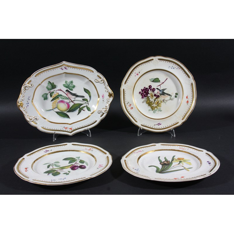 ENGLISH PORCELAIN PART DESSERT SERVICE, mid 19th century, painted with large fruit and flower sprays with birds and insects, inside a moulded and foliate border, comprising two oval dishes and four plates, (6)