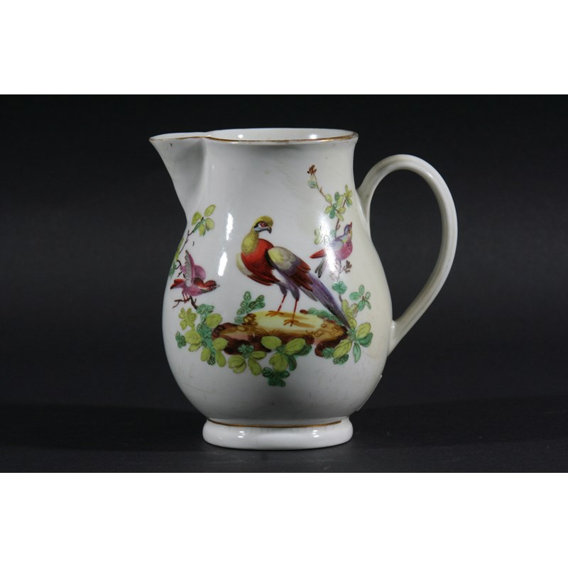 ENGLISH PORCELAIN CREAM JUG, probably Plymouth circa 1760, of ovoid form and painted with birds in branches, height 13cm