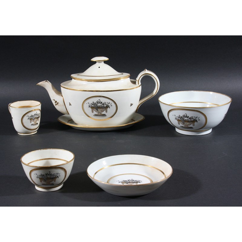 early 19th century, pattern N. 91, of fruit en grisaille in a gilt basket, comprising teapot, cover and stand, slop bowl, sucrier and cover, six coffee cups, nine tea bowls and saucers, N 91 painted to some undersides (parcel)