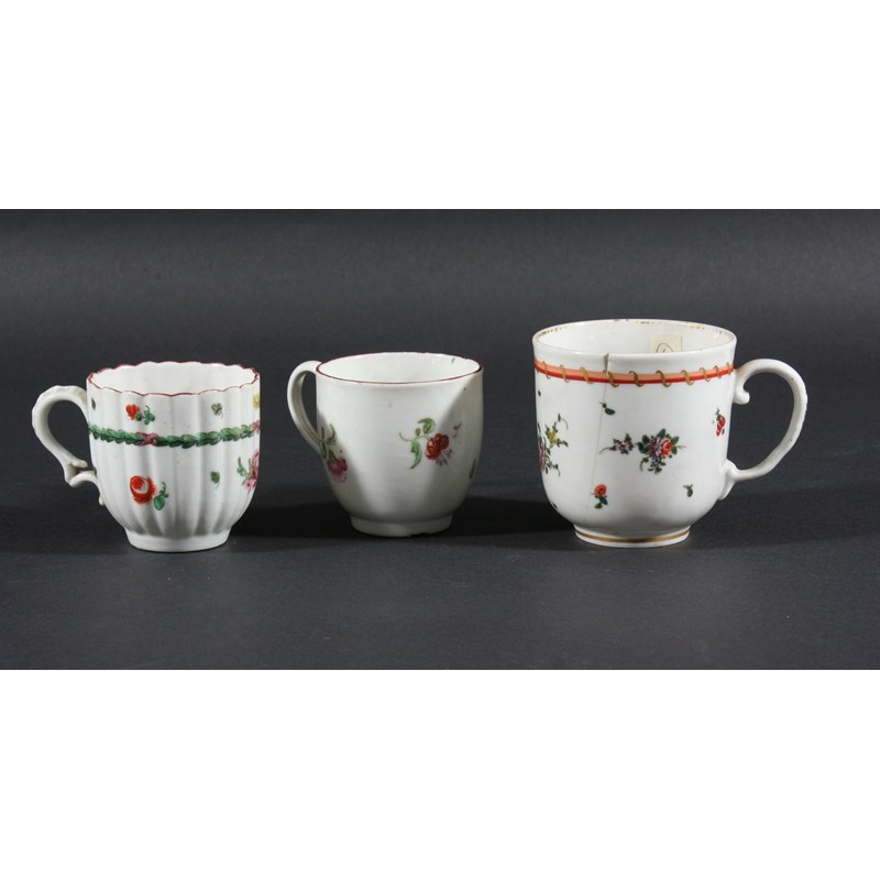 circa 1775, possibly by Henry Bone, painted with floral sprays beneath a pink and iron red band with gilt highlights, blue X to base, height 7.5cm; another of reeded form, painted with sprigs beneath a laurel leaf band and iron red rim, blue X and B to base, 6cm; together with a third painted with a floral spray beneath an iron red rim, blue painted X 16 to base, 6cm (3)