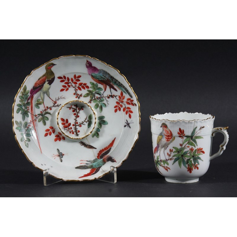 painted with exotic birds in branches inside a shaped and gilded rim, gold anchor marks to both, diameter of saucer 13.5cm (2)