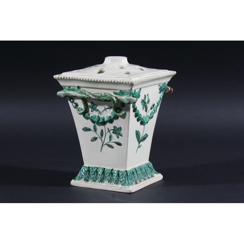 early 19th century, possibly Leeds, of tapering square section with serpent handles, moulded harebell swags and stiff leaf foot painted with green floral sprays, beneath a pierced cover, height 15cm (2)