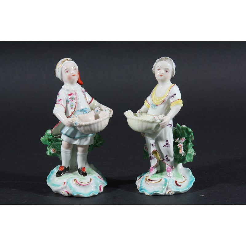 PAIR OF DERBY FIGURAL SALTS, later 18th century, patch marks, the couple holding small baskets before bocage, height 11.5cm (2)