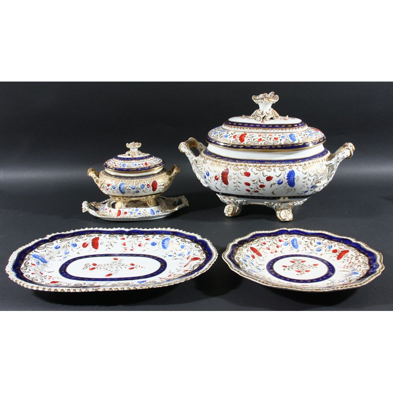 circa 1820, with painted and gilt floral sprays inside a blue border and scalloped rim, comprising soup, vegetable and sauce tureens, covers and stand, platters, plates and bowls in various sizes, impressed marks to most (135 approx)
