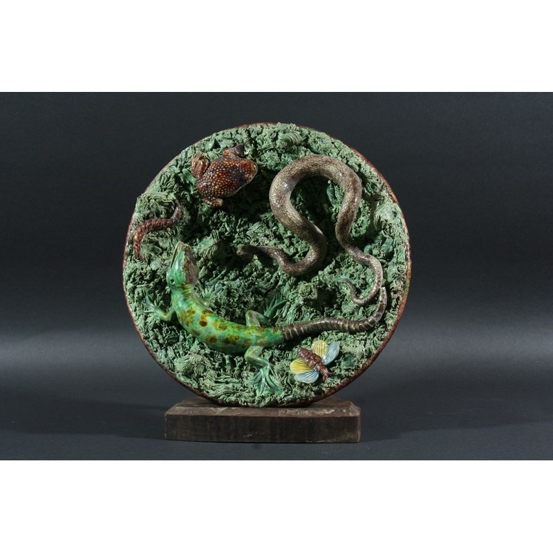 PORTUGUESE PALISSY STYLE PLATE, earlier 20th century, decorated with a lizard, snake, toad and insects on a shredded clay grass ground, impressed marks, diameter 30cm