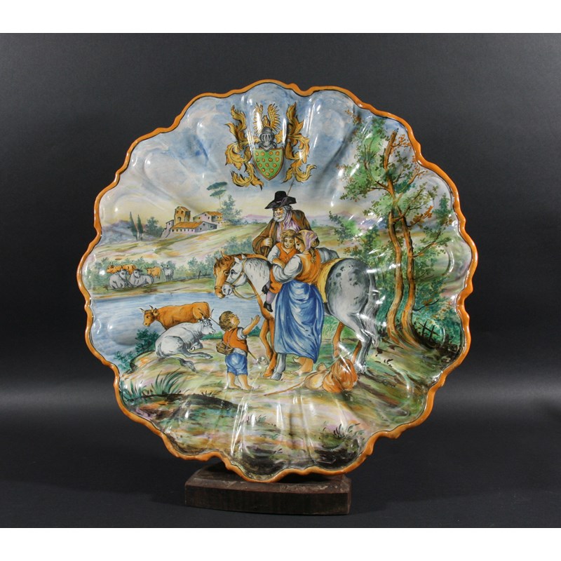 ITALIAN MAIOLICA CHARGER, 19th century, of scalloped form, painted with a scene of a family with horses and cattle by a river beneath a crest, diameter 49.5cm