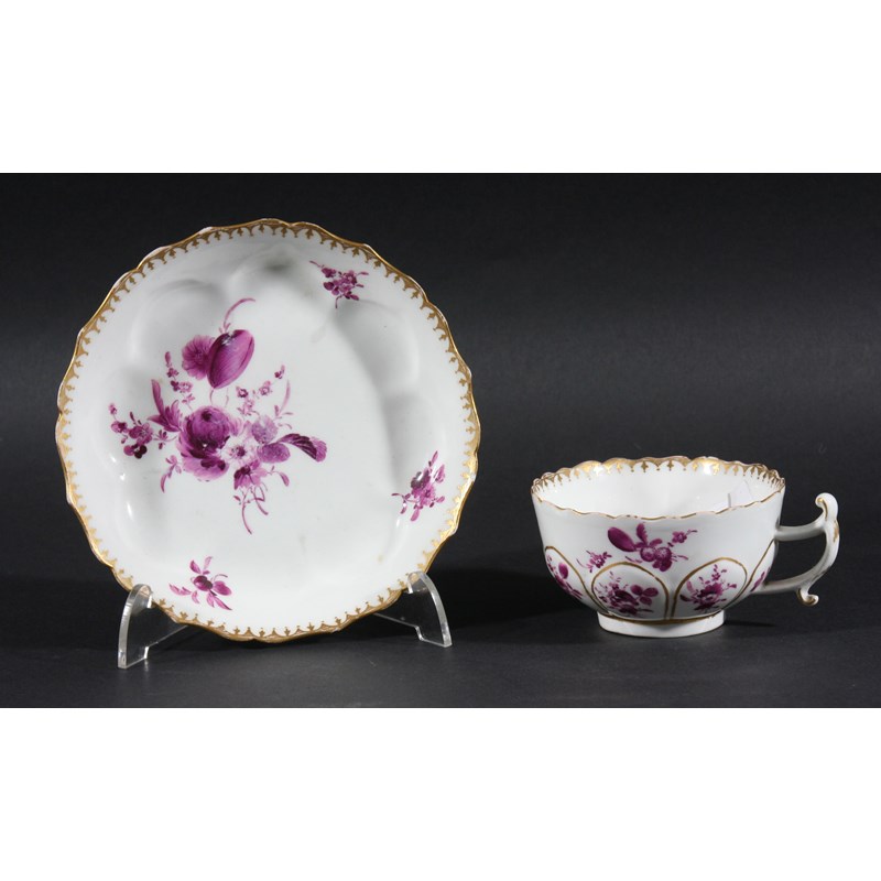 MEISSEN TEA CUP AND SAUCER, 18th century, puce painted with floral sprigs on raised arching panels beneath gilt rims, blue crossed sword and dot marks, saucer diameter 14cm (2)