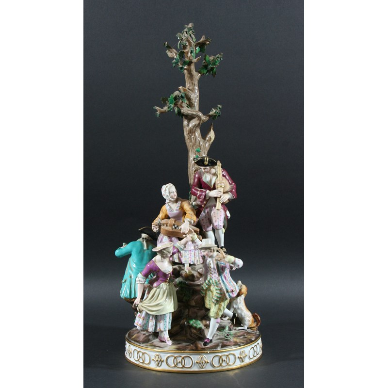 MEISSEN STYLE CENTREPIECE, 19th century, modelled as three pairs of revellers and a dog around a tree on a rocky outcrop, blue crossed sword and incised marks, height 51cm