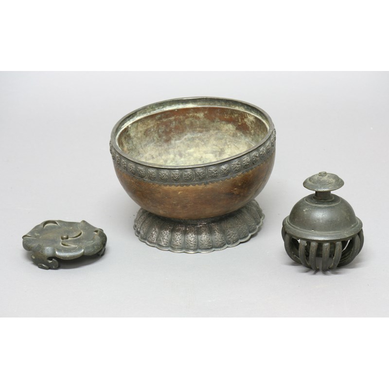 INDIAN WOODEN AND WHITE METAL MOUNTED BOWL, possibly 18th century, the rim and foot with chased foliate panels, diameter 25cm; together with an Eastern bronze bell and a stand (3)
