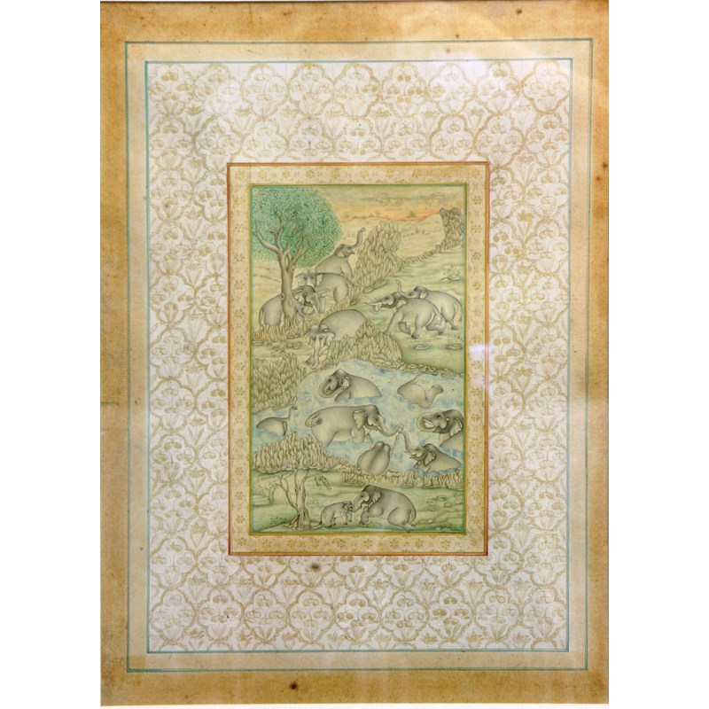Elephants bathing in a Stream, coloured pigments on paper with gilt highlights, inside a gilded mount, image size 23cm x 14cm