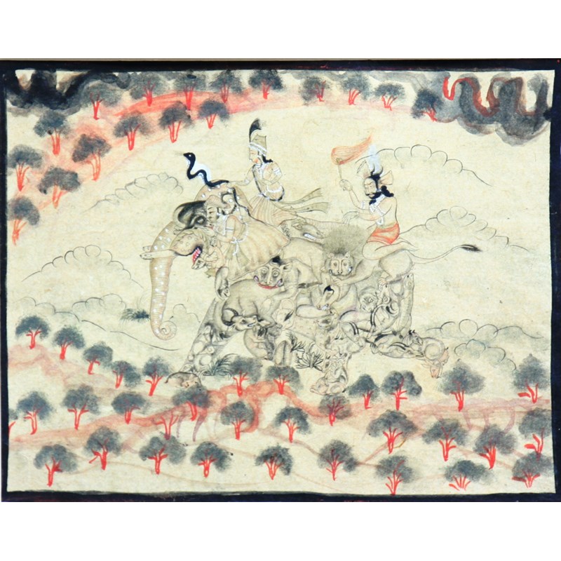 late 18th century, Composite elephant ridden by a peri and a div, the body made up of numerous symbolic animals, en grissaille with white and red highlights on paper, height 14cm, width 18cm