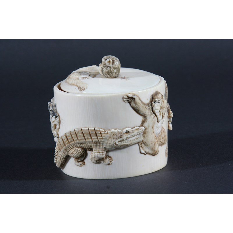 JAPANESE IVORY BOX AND COVER, carved with a monkey, crocodile, tiger and lion, the cover with a monkey and monkey head finial, diameter 9cm