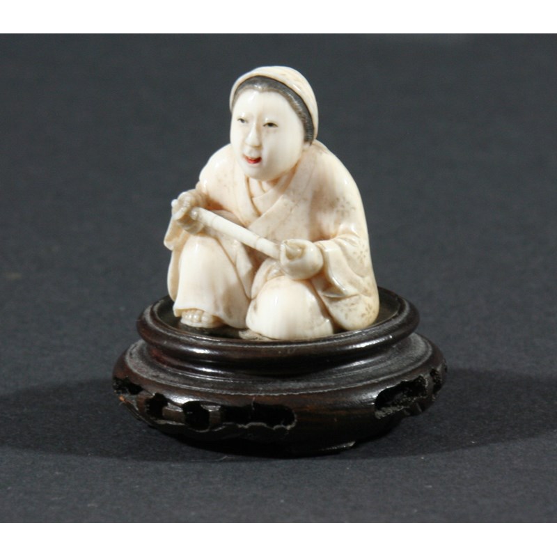 the first carved as a kneeling lady, height 3.5cm, together with a man asleep in a bowl, 3.8cm and two figures in blankets, 4.5cm (3)