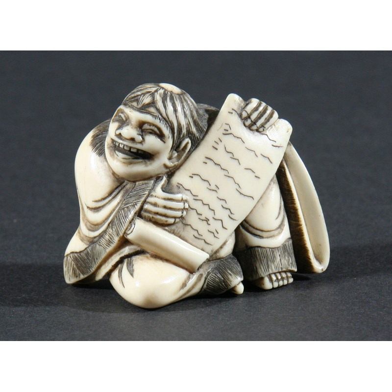 JAPANESE IVORY NETSUKE, carved as a grinning man holding a scroll, height 4.5cm