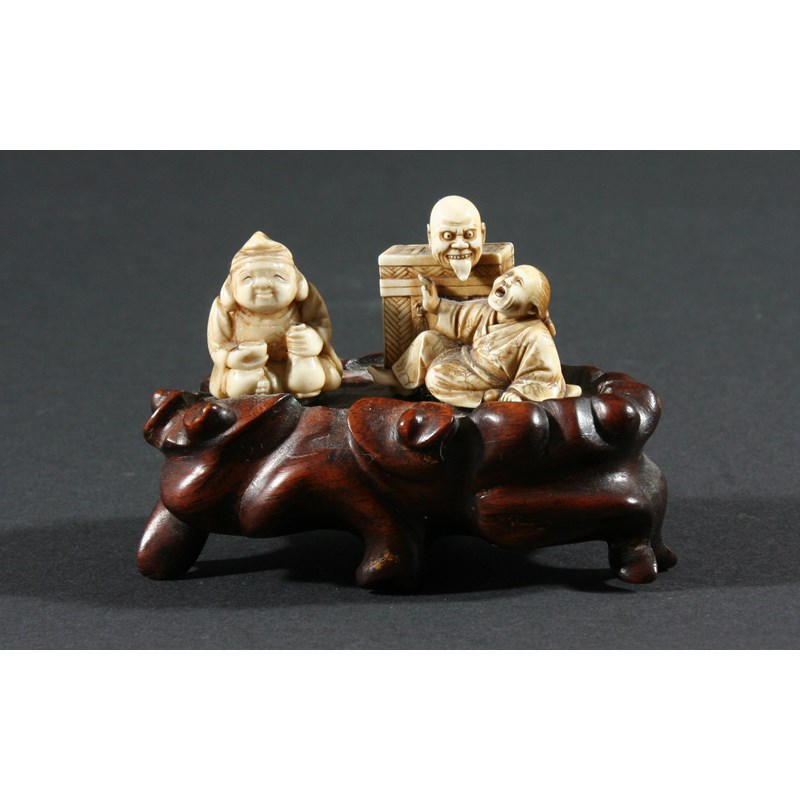 TWO JAPANESE IVORY NETSUKE, of demons appearing from a box and a seated figure, on a hard wood mount, height of demons 3.5cm