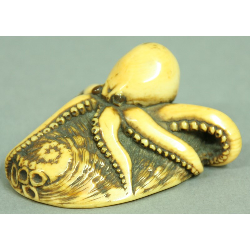 JAPANESE IVORY NETSUKE OF AN OCTOPUS ON A SHELL, Meiji, with tiger's eye eyes, unsigned, 6cm