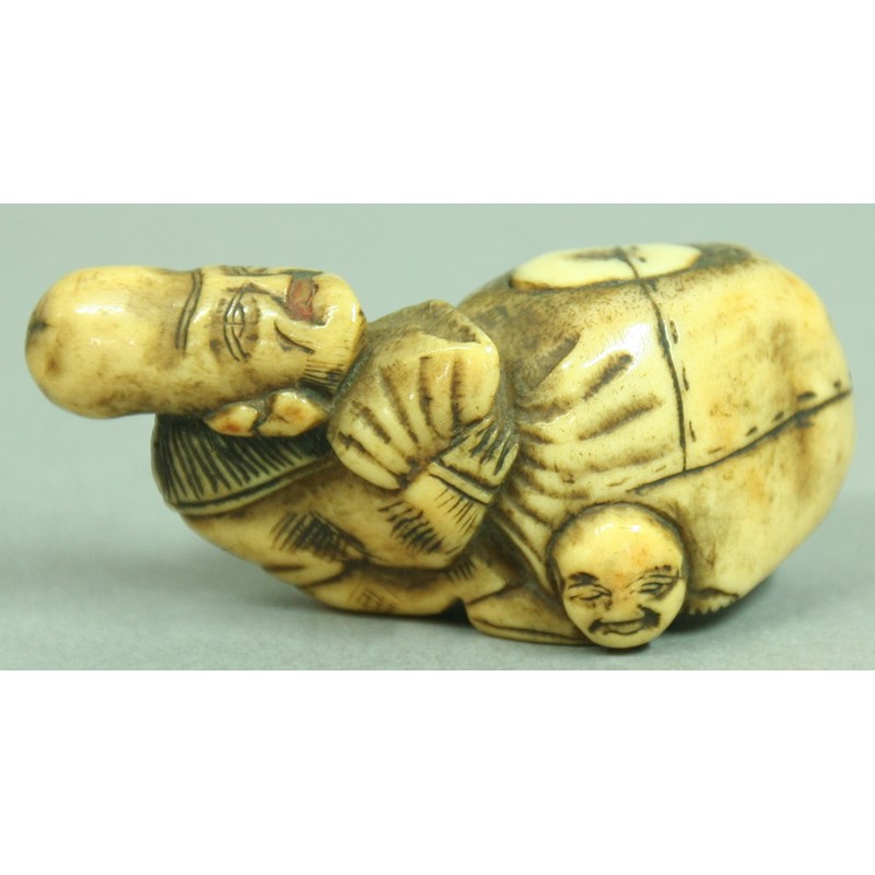 signed, height 4cm; together with another of a man standing and a third, probably bone, of a man with a boy in a sack (3)