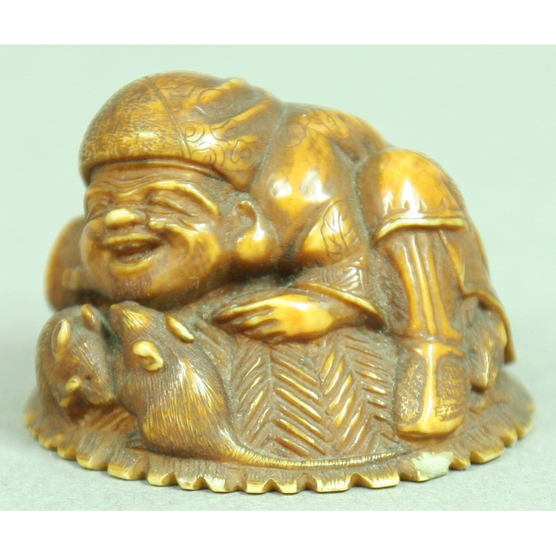 JAPANESE IVORY NETSUKE OF A MAN AND RATS, resting on a basket, signature, diameter 3.5cm; together with another of a man standing on one leg and a third of a man with a large sack (3)