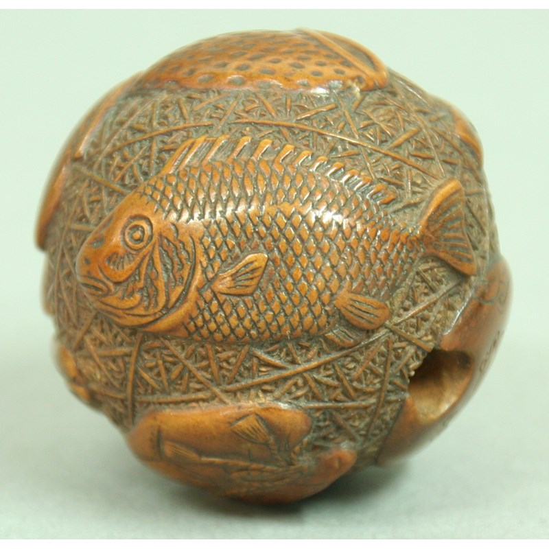 JAPANESE WOODEN NETSUKE OF MAN IN A BASKET, inset ivory plaque signed Hopee, length 3.5cm; together with another of an oni sheltering under a basket and a third of ball carved with fish and other objects (3)
