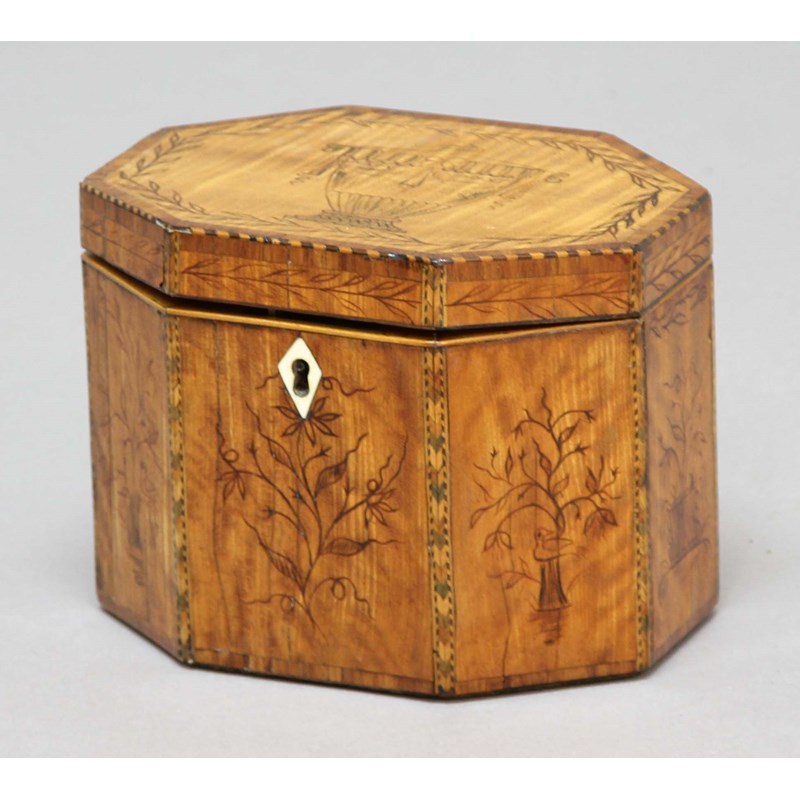 GEORGE III SATINWOOD AND PENWORK TEA CADDY of octagonal form, decorated with an urn and foliage, with single canister interior, height 11.5cm, width 15cm, depth 11cm