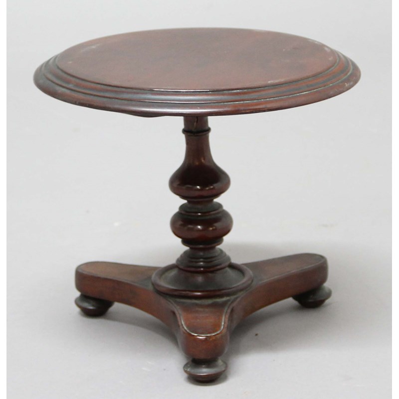 MAHOGANY MINIATURE TILT TOP TABLE, 19th century, with turned column and triangular platform base, height 21.5cm, diameter 24cm