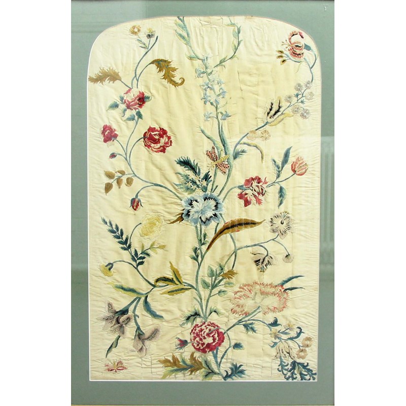 GEORGIAN SILK EMBROIDERERD PANEL, 18th century, worked in colours with butterflies amongst flowering foliage, 90cm x 56cm