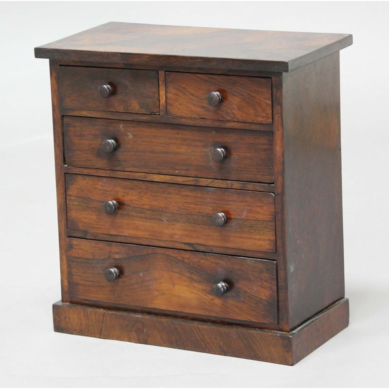 ROSEWOOD MNIATURE CHEST, 19th century, two short or three long drawers with turned pulls, height 29cm, width 27cm, depth 14cm