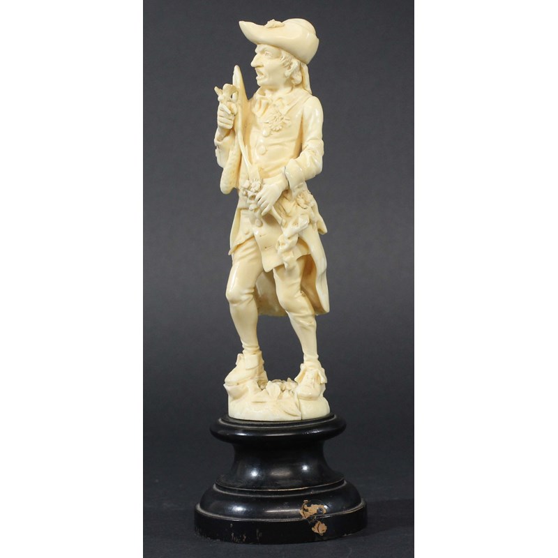 DIEPPE IVORY FIGURE, 19th century, of a gentleman carrying a butterfly net and a butterfly, height excluding plinth 18cm