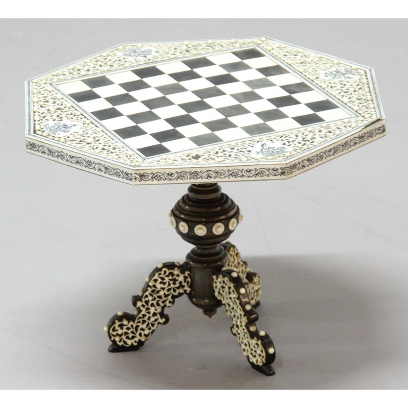 19th century, of octagonal form on a turned column and tripod base, inset with ebony and ivory board and pierced, scolling foliate border with cartouches of gods, the base with pierced ivory, scrolling decoration, height 19cm, diameter 27cm; together with a part miniature chess set, natural and stained red, height of king 4cm, height of pawn 2.5cm (lacking two red pawns and three white pawns (28)
