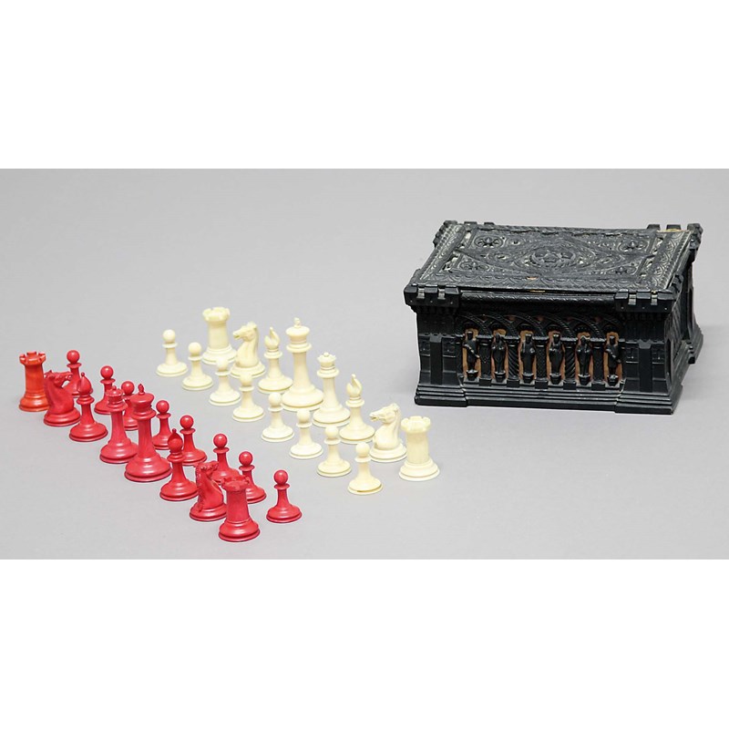 natural and red stained, in a Carton Pierre box, the label beneath inscribed The Staunton Chess-Men, Ivory, Entered No. 3442 and with facsimilie signature, marked Jaques London to the white king and with a crown to the forehead of some knights, height of king 7cm, height of pawn 3.5cm, case height 10.5cm, width 20.5cm, depth 15cm