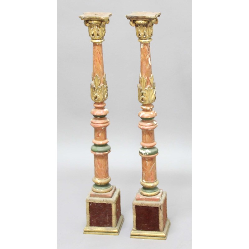 PAIR OF CONTINENTAL POLYCHROME CARVED WOOD CANDLESTICKS, perhaps Italian and 18th century, with gilt, stiff leaves and turned knops, height 92cm (2)
