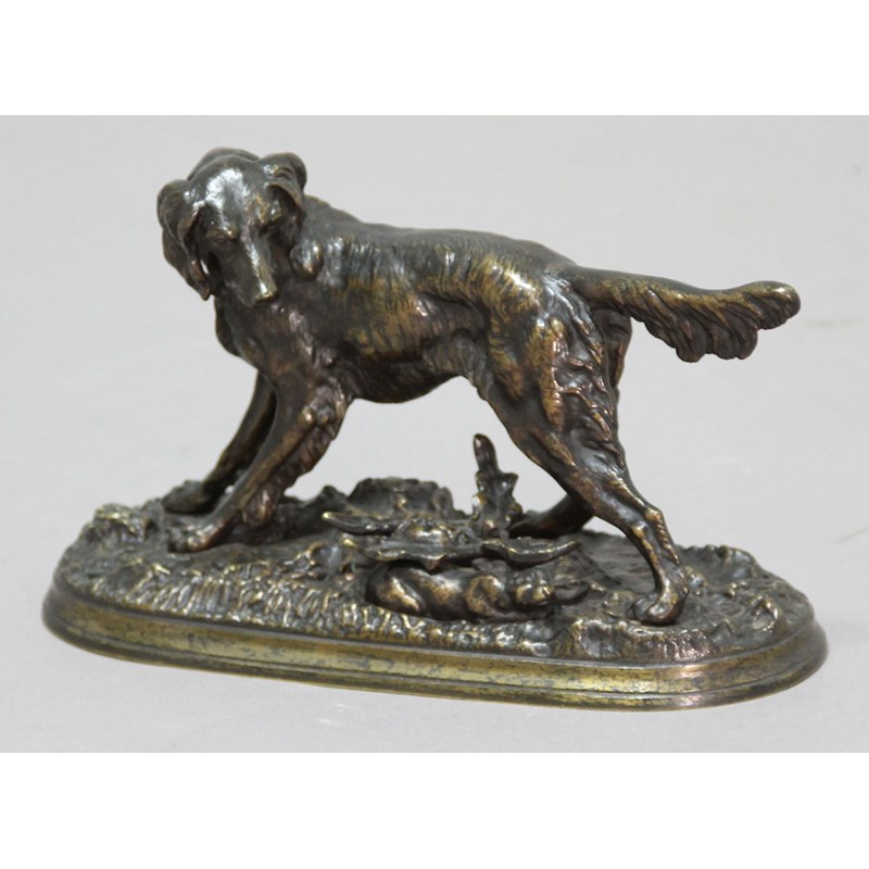 19TH CENTURY SCHOOL, Retriever standing above a hare cowering beneath leaves, on an oval base, bronze, length 21cm