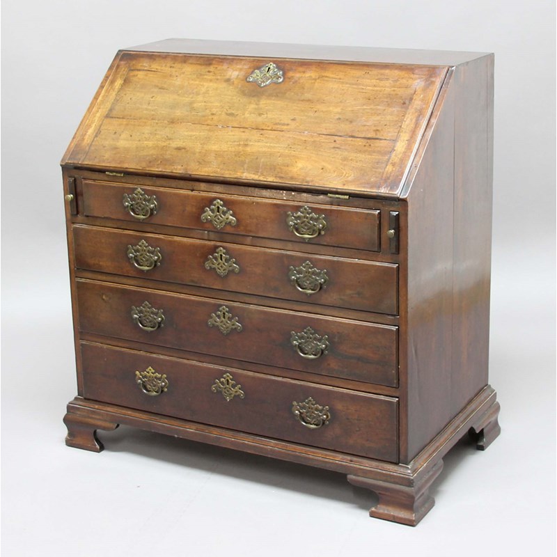 GEORGE III MAHOGANY BUREAU, with a fitted interior above four graduated long drawers, height 98cm, width 92cm, depth 53cm